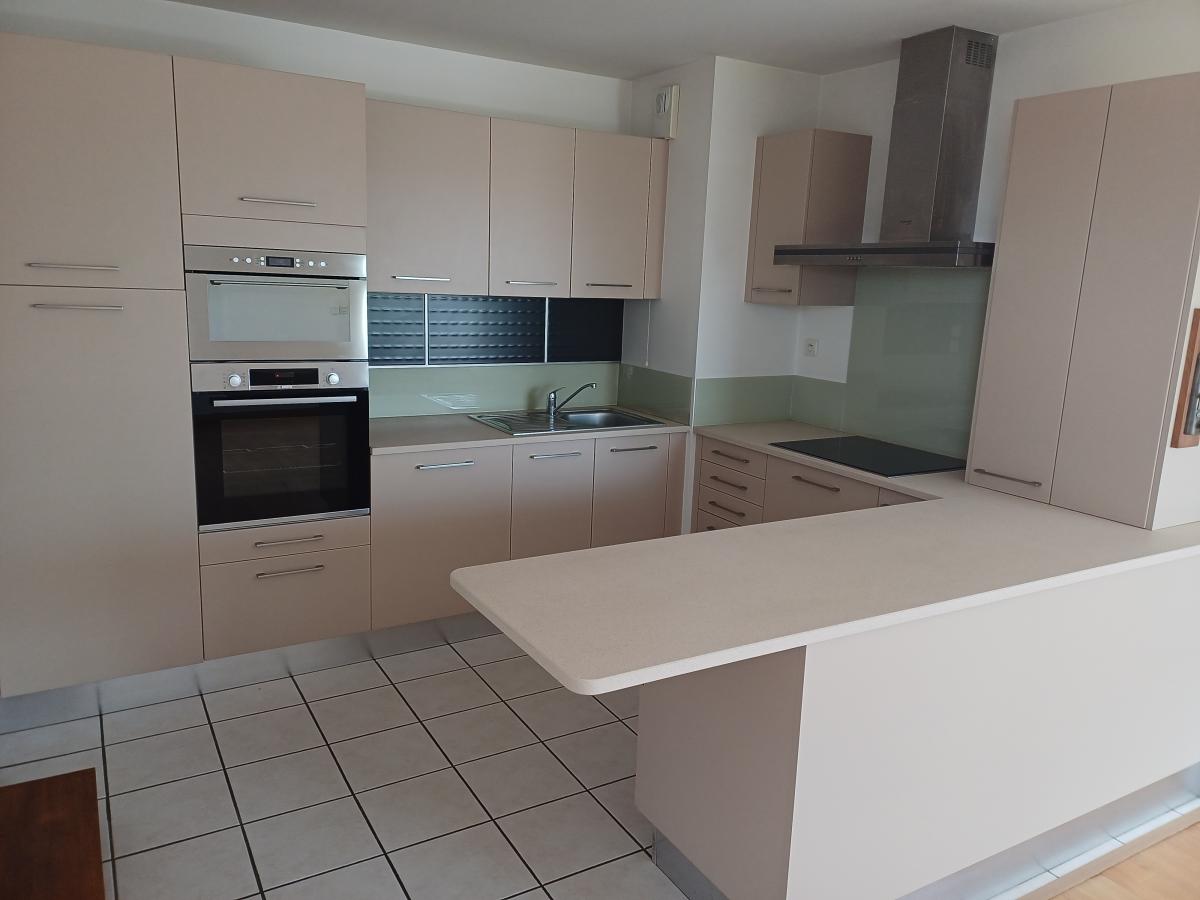 Cuisine équipée (four, micro-ondes, plaques de cuisson, hotte, rangements hauts et bas).