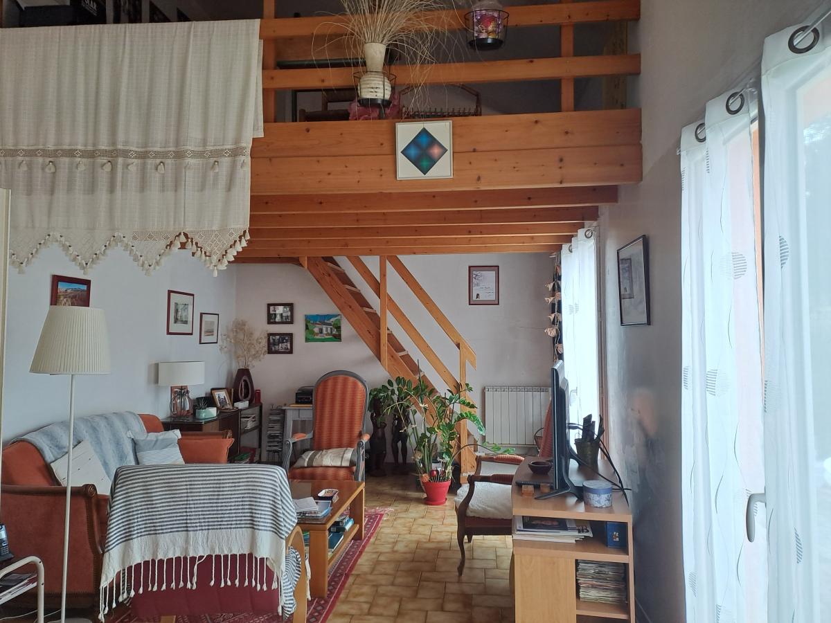 La maison se compose d’une pièce de vie lumineuse, exposée plein sud, ouvrant sur le jardin, avec une mezzanine surplombant le salon — idéale pour un bureau, un coin détente ou une salle de jeux.