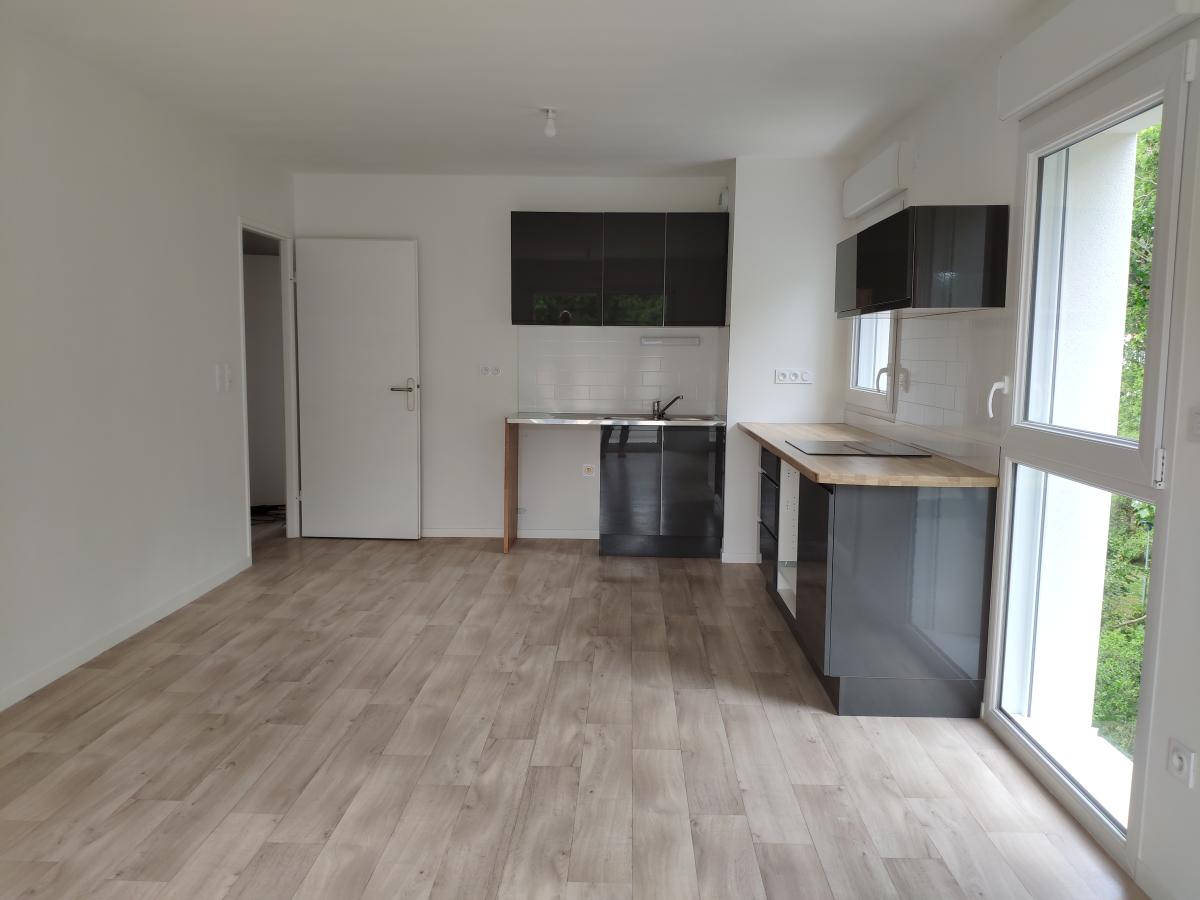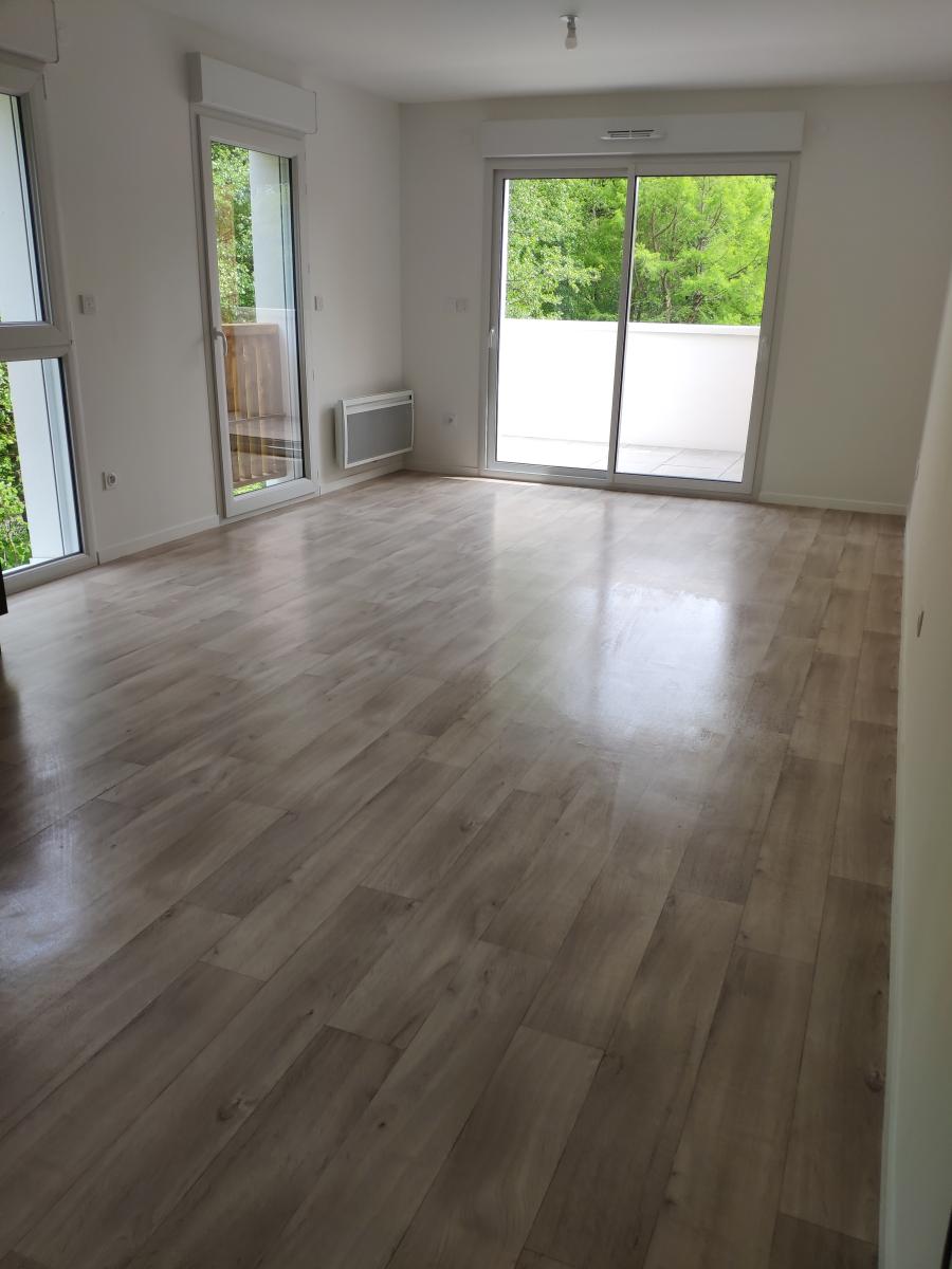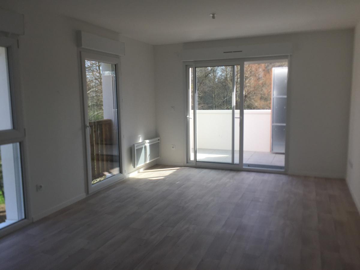 A BOUGUENAIS Bourg un appartement 2021 - T3 64,65m² comprenant entrée avec placard, chambre avec placard, WC séparé, salle d'eau, chambre, séjour/cuisine donnant sur balcon 5.70 m2 avec petit cellier. Un grenier privatif au 3ème étage, une place de parking extérieure.