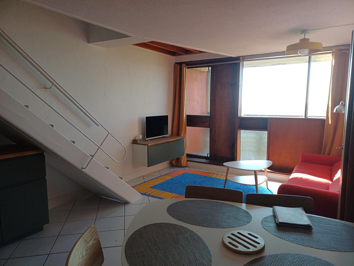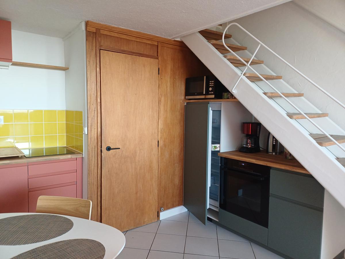 * Au premier niveau, une entrée, une kitchenette aménagée et équipée ouverte sur la pièce de vie donnant sur une première loggia (5.36m2).